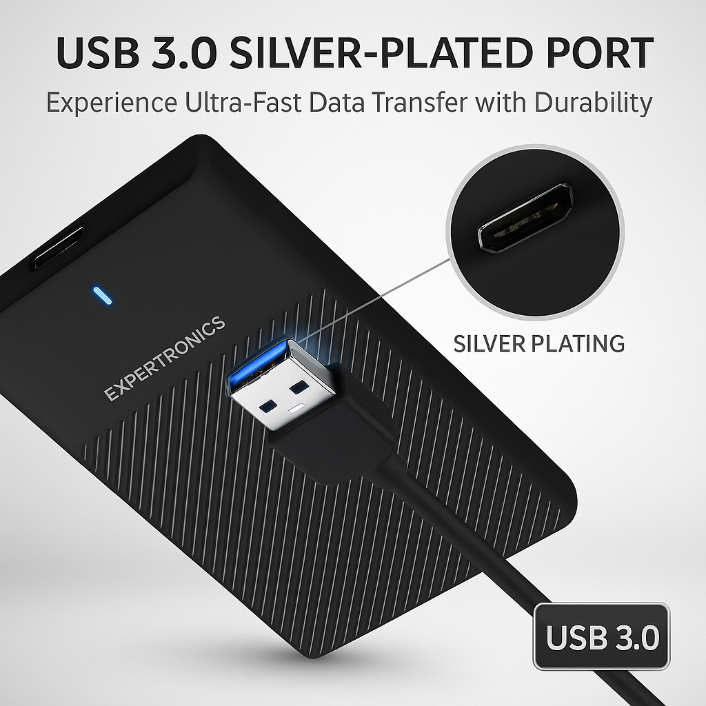 Enjoy fast, reliable, and efficient storage performance with our USB 3.0 External Hard Drive. Featuring a high-speed USB 3.0 interface with a silver-plated connector, this hard drive ensures quick and stable data transfer for all your files, videos, and documents. With transfer speeds of up to 5 Gbps, you can move large files in seconds without lag or interruptions, making it perfect for both personal and professional use.